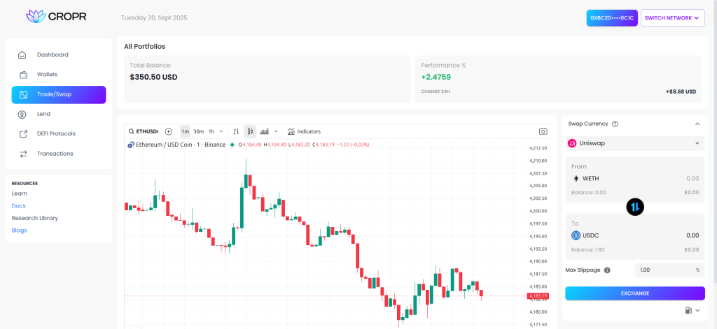 This is exactly why CROPR integrates trading across Uniswap, Sushi, PancakeSwap, Dodo, Curve, Aerodrom, and Balancer into one place with multi-DEX trading so you can pick the venue that suits the trade before executing it. After execution, use transaction tracking to confirm the fill and make sure your multi-wallet cross-chain portfolio view lines up with reality.